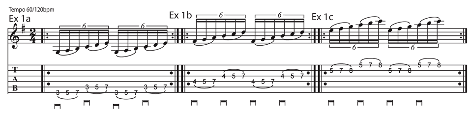 In all these exercises be aware of the following things: Fretting hand: follow the rule that in order to keep the technique clean you set up the first finger to mute the string above the one you are playing, most noise will come from this string. The first finger will make contact with the string that you are playing lower down on its pad, compared to the other fingers that should be slightly arched and making contact nearer the tip. As a result of this you should see that the first finger is lying over any higher strings and muting them too. When you do fig 1a, all the strings would be muted by the first finger except the low string being played, as you cross onto the A string, the tip of the index finger then mutes the string above (the previously played low E string) and all the higher treble strings underneath the finger. The right hand starts to mute as you move up to the middle two strings, so when playing on the D string for example, the right hand will mute off the low E string by resting on the heel of the hand, which may also involve the fleshy thumbpad resting lightly on the front of the guitar. So between the two hands it is possible to obtain a completely clean technique with no string noise in the background.