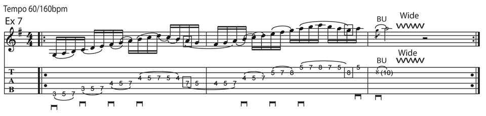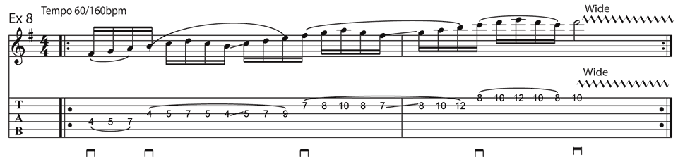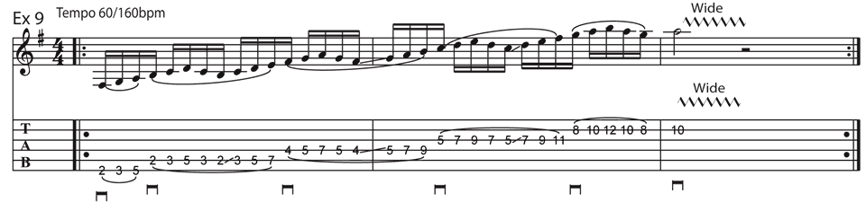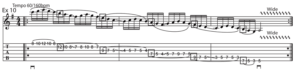Ex 8: This next example is a sixteenth note phrase with the slide every two beats. The slide enables us to glide through the positions seamlessly. Aim to play the pick strokes as lightly as possible and maintain an even velocity through the positions. Try to perfect the time keeping by playing along with the slow version, building speed gradually over months of daily practice. I have recorded the remaining examples firstly at our slow “learn” tempo of 60bpm, then at standard top sixteenth note speed of 160bpm and then to demonstrate the freeform effect I have kept the tempo at 160bpm and played as fast as possible trying to feel the nearest and most convenient target exit note. This may seem haphazard, but most modern rock players use this technique as a fifth gear and are often more conscious of the effect that it creates rather than strict subdivisions. Once you can play sixteenths at 160bpm, you’ll find that you can easily accelerate the technique and play freely over the pulse whilst still being aware of the beats underneath.
