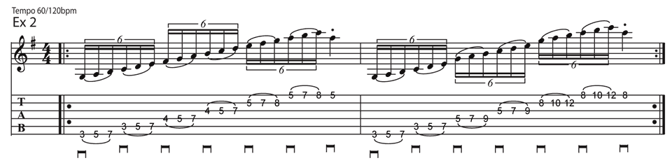 Ex 2 : After the repetition fragments, we can explore the next level and apply our skills to 6 string runs. In bar 1, the technique is applied to the scale shape and in bar 2, the run is applied over 3 octaves, Octave blocks are very common visual pathways on the fretboard in modern rock. Simply take the first 2 strings (6 notes) of any scale shape and then play up in octaves rather than following the scale position. You’ll notice that the pattern that is established on the first 2 strings is identical as it moves over the string sets. This is good for potential speed. Once you have become accustomed to this example, do the same in all 7 positions. It’s a great way to memorise your scale/octave patterns whilst practicing your technique.