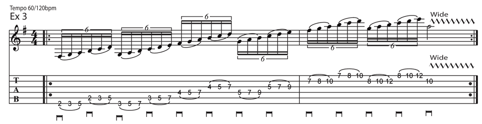 Ex 3: In this example, we are joining position 6 and position 7 symmetrical 2 string patterns together before applying over the fretboard in 3 octave blocks every 2 beats. The last note uses tone wide rock vibrato. The linking together of symmetrical shapes is common in modern rock as it facilitates longer fretboard coverage and lends itself more readily to faster ideas than the more offset, unsymmetrical areas. The “Exit” or finishing note uses tone-wide/ push-upwards rock vibrato and is played on the index finger. In order to get the aggressive vibrato happening, it is important as you ascend onto the high two strings, that your thumb moves to the top of the back of the neck and over upon hitting the finishing note. The vibrato comes from a rotation of the wrist similar to turning a key in a lock and pivots from the thumb over the neck and index finger jammed just above the main knuckle under the fretboard. The fingers themselves must remain rigid.