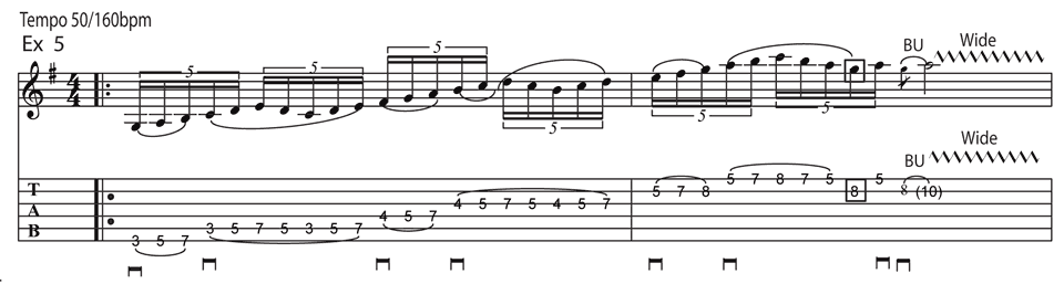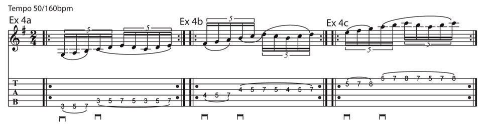 Ex 4: These next repetition fragments give a workout for the development of groupings of five. Try to tap your foot on the metronome and strive for an even velocity with the picked notes being the same dynamic level as the hammer-ons and pull-offs. The first example has three notes on the lower string and seven on the higher string. This equals ten, so despite the string change after three notes, we still feel it as two groups of five. Therefore concentrate on tapping your foot on the high fourth finger hammer-on and try to hit harder slightly in order to accent it. This will help lock in the five’s feel. Imagine a pendulum swinging and you are accenting the lowest and highest notes and reinforcing that feel by tapping your foot. Keep your thumb in the middle of the back of the neck with your hand wide open and close to the fretboard in order to mute.