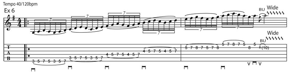Ex 5 and 6: These next two examples are odd note groupings played through with the full roll legato technique and are in the style of highly influential rock virtuoso Joe Satriani. Highly recommended is Joe’s legendary guitar instrumental debut “Surfing with the Alien,” released in 1987. The first example is in quintuplets and the second example is the same run applied to septuplets which is a roll and a half. Listen to the slow audio demonstration to feel the timing and learn and memorise slowly with good tone and timing before applying any speed. Try to keep all notes equal in velocity and even in tone. This style of legato requires more stamina than our earlier ½ roll examples and will need short but regular daily practice sessions to gain familiarity over a week or so. When any tension builds up in the forearm, it is critical to shake off immediately. The licks both exit on a bend from the b7 to the root note A. After the bend, lodge the pick into the string above to ensure a clean tone wide rock vibrato.