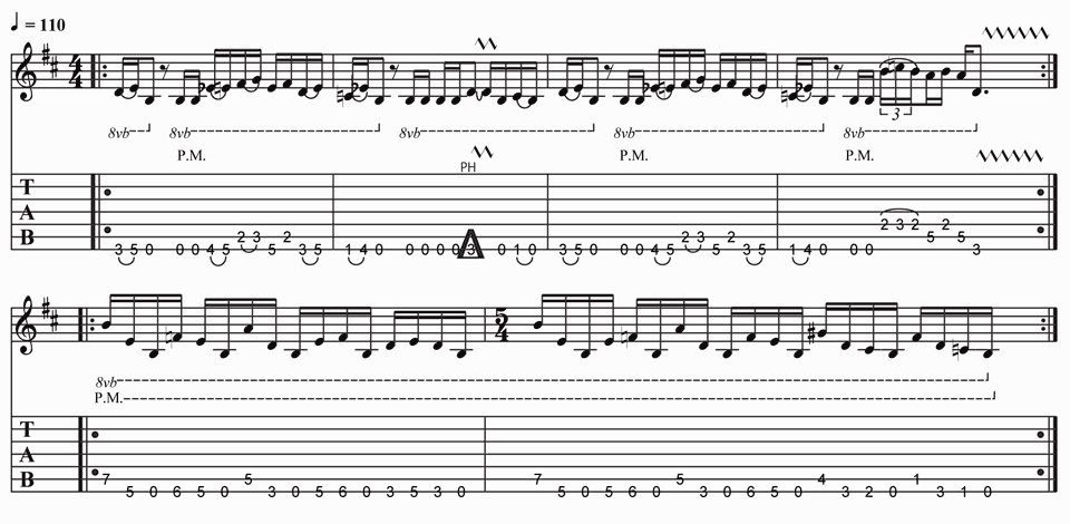 Here we have a 7 string single line riff that features some pull-offs and a nice pinch harmonic before settling into a strict alternate picked idea using the open B as a pedal note. Practice this slowly to gain the articulation with some slight palm muting. Mute off any string noise by keeping the fretting hand index close to the strings as you play the idea.
