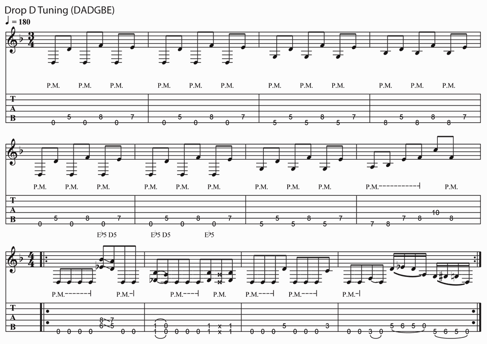 This next riff is a single line in ¾ time, which leads to a half time, old school thrash inspired riff which uses downstrokes with a neat hammer-on and pull-off fill at the end. Watch the fretting hand index finger muting the string above the one being played on this riff so as to get the note separation clean.