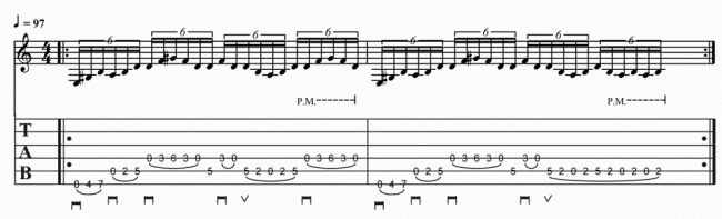 Here we have an amazing sounding legato riff that utilises open strings in conjunction with a two note per string diminished arpeggio. Use fingers 1 and 4 throughout, except for the left hand hammer in beat 3 which is played using the third finger. Try to strive for an even dynamic tone. No note should be louder or weaker sounding than the next, and the pick strokes should be light so as to provide the smooth flow of notes. In beat 4, I gently palm muted the notes to give a more percussive quality.