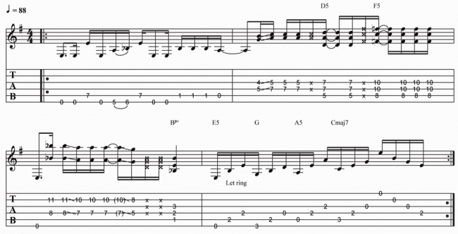 You’ll notice at the end of bar 3 there is a chord that looks like a diagonal line. This chord is voiced R b5 R and implies a diminished sound which is common and effective in this style. I would recommend using alternate picking for the open arpeggios in the last bar.