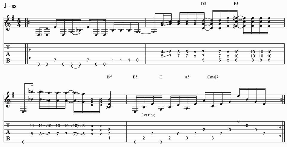 Here is a cool riff that starts in the first bar with a bluesy single line idea before developing from an interval (Am) into powerchords, octave slides and finishing with a turnaround of open string arpeggios! A lot of Opeth’s riffs will require you to develop a loose folk strumming technique rather than the more common thrash metal orientated rhythm posture, so move the wrist from the arm and hit the strings lightly.