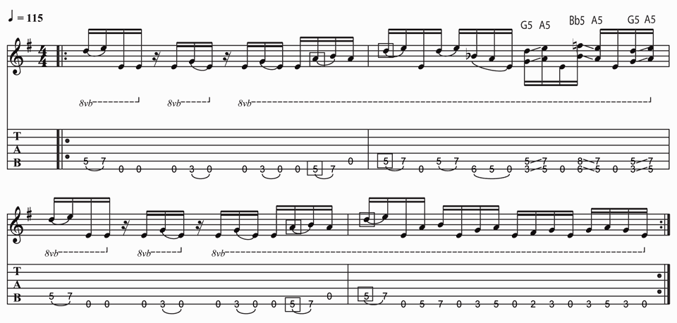 Here is a riff that utilises some left hand hammer-ons. With this particular technique, practice slowly in order to develop the power and accuracy needed to sound the note clearly. Also you’ll notice the sixteenth note rests are as important to the groove as the notes themselves, so try to play as staccato as possible, using the left hand fingers to mute all the strings in the rests.
