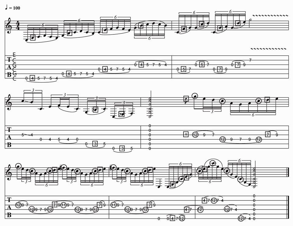This particular mode is a tonality frequently heard in Devin’s work and provides an atmospheric quality to his compositions and soloing. While you are looking into this example it would be a good idea while your guitar is tuned to C to investigate some scalar concepts. The tuning we are using is in Fifths across 2 string sets, so you can take your 3 note per string major scale shapes and play the first six notes, going up in octaves simply by playing the exact same shape across the strings vertically!