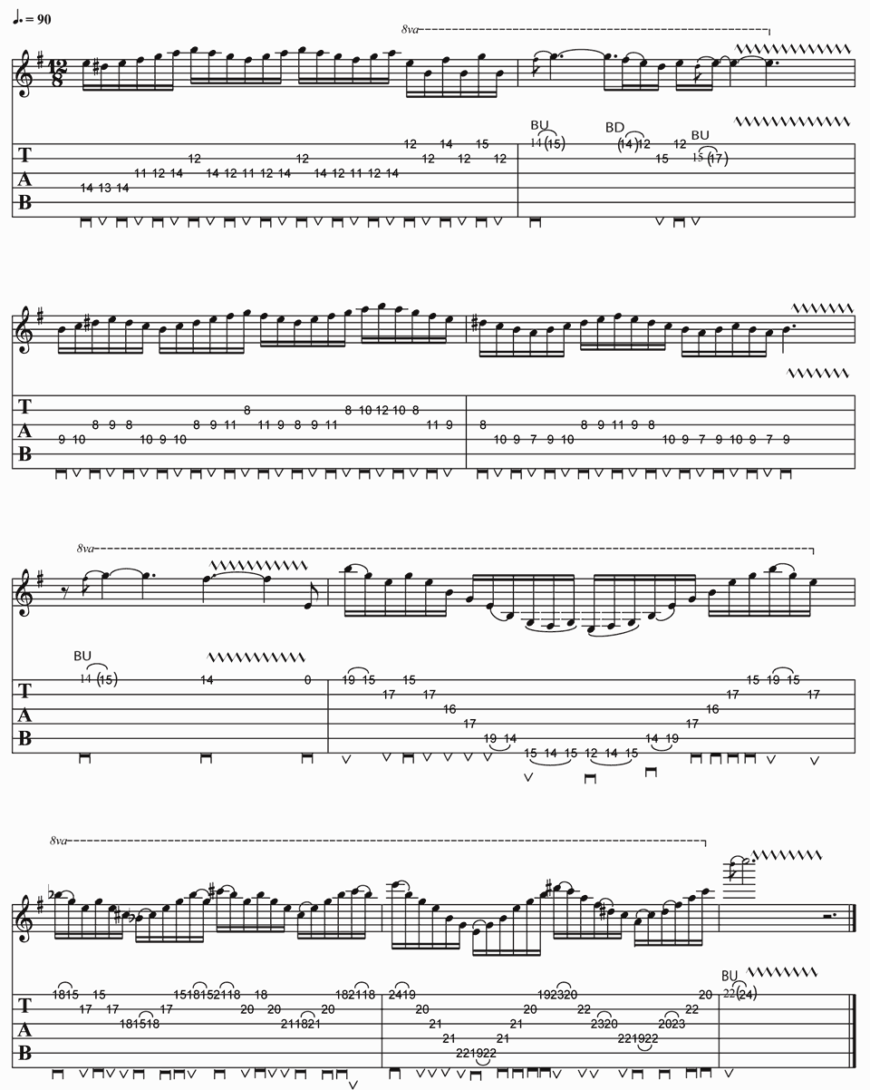 Here we have a stylised lead break, taken from Jeff Loomis’s solo on The Learning from the album The Politics Of Ecstasy. In the first bar we have some melodic alternate picking in E Harmonic Minor R 2 b3 4 5 b6 7, which develops into a pedal tone phrase before exiting in bar 2 with a nice semi-tone bend into an Em Pentatonic type lick. A consistent and even picking tone will be needed, with all notes very lightly palm muted. On the exit bend in bar 2, be aware of the tone of the note and the subsequent vibrato as these elements are the key in gaining the modern rock sound needed for this style.