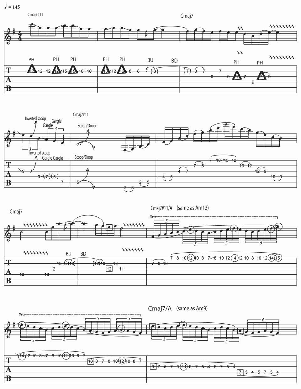 This last example is a solo study based on some of Steve Vai’s trademark techniques and improvisational devices. The backing track is based on C Lydian (R 2 3 #4 5 6 7 ) for the first four bars, followed by a change to A Dorian (R 2 b3 4 5 6 b7) for the next five bars. Both these modes are in the key of Gmajor, and in fact the same vocabulary of ideas can be used over both of these modal sounds. The first half of the solo is played using a wah pedal, the first four bars with the wah fully forward in it’s treble position. This sharp and cutting tone especially helps to bring out the pinch harmonics that are featured in the first three bars. In bars 4-5, there is some whammy bar work, that serves to highlight the way Vai applies different sounds to each individual note of a melody line. I would advise memorising the line without any nuance, and then working on each note separately with the whammy bar, firstly a reverse slide into the first note of the phrase, then an upwards scoop on the second note, followed by a plain note then two gargles before finishing with a scoop/doop! Then in bars 5 and 6 there is an ascending three octave Gmaj7 arp which slides up to the fifteenth fret and descends a Cmaj7 arpeggio, both these arpeggios are in the key of G and are commonly superimposed over both C Lydian and A Dorian progressions.